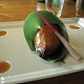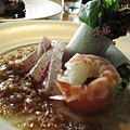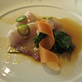 開頭以松久桑著名的改良生魚片冷碟上陣,用 tabasco 風味的辣醬取代芥末醬油,這種招數的確很 fusion,只是當日天氣實在太熱,感覺魚材溫度可以再低一點,入口口感會比較好,且應不至於失味,不過擺盤簡單的有點讓我不知所措,一下子還以為這是不是未完成品啊?第二道海鮮盤,鮪魚赤身たたき,下面襯托的卻是焦糖化了的米醋炒洋蔥,這個搭配是當天最 surprisng 也是最 unique 之處,主廚思索變化搭配之用心令人佩服,明蝦香甜,蘿蔔生菜捲爽口,對不瞭解日本料理的人來說,這是一個很日本風,但卻不會太日本味的美麗結合,整道海鮮盤可謂上乘之作,尤其,當你知道主廚來自美國的時候。