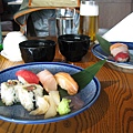 最後上的是壽司盤與味增湯,赤身、真鯛、旗魚做 にぎり 各一貫,另有花壽司兩貫,食材感覺與第一份生魚片冷碟差不多,溫度可以再低一點來適應當日天氣,魚材尺寸與醋飯比例極佳,但是芥末比起一般日本用量要少些,大概是怕當地客人還不適應,入口輕咬即散,化成一股香甜,花壽司捲得小巧,鬆透感卻很夠,不會像台灣某些自命高級店搞成飯糰一塊,名店師傅手藝果然不同;湯頭紅白味增比例調的不錯,但整體來說還是比日本本地要淡了點,其實港人喝湯時還挺能接受各種口感的,不妨下點重手,或許能有更好的反應?吃到後來感覺已是西式而非日式料理了,即便以壽司收尾亦作此感,所以服務人員詢及甜點時當然就來杯 espresso 囉,double,謝謝;抹茶冰淇淋甜而不膩,有講究;巧克力塔切開一股巧克力醬如泉湧,兩者同放漆木盒裡來個冰火二重天,算是開鰻魚飯一個玩笑吧?