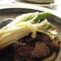 接著來了份照燒銀鱈,材料沒問題,甜嫩多汁,照燒醬的焦香讓人食指大動,擺盤照例極簡化,不過竹葉包鱈魚、一支嫩薑配白盤,這回到讓我有點『蓑衣翁撐篙而沿溪上』的小小詩意~而後轉上紅肉,美國 Prime 等級沙朗牛排切片佐以蘆筍尖及金針菇,據服務人員表示他們也有準備和牛,但是除非客人特別表示,通常都以美國牛出菜,我是無所謂啦,畢竟沒有難養到那種程度,而且至少當日美國牛肉品質頗佳,倒也其樂融融。