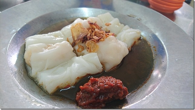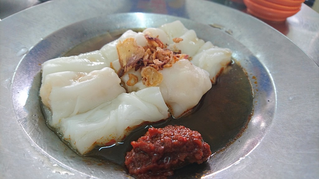 腸粉緊且扎實,看來不過小指無名指合併起來那般粗,粉皮味香而濃,很抱歉的說,這比香港幾家號稱『平民一星』但實在不知所云的店要正點太多了,上面放上蒜酥蝦皮,碟邊一抹東南亞的魚露辣醬,舌頭上想起來的卻是濃濃潮州味。