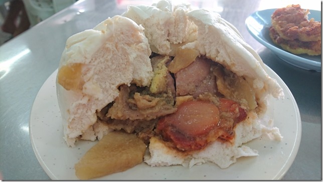 滷肉、叉燒,裡面居然還有藏著滷蛋?!這種內餡說真的小弟弟我第一次遇到,感覺得用『海量』來形容了,整個包子約有三分之二個壘球大小,不知道是否其他各店的大包也都是這樣驚人尺寸?然後還有一片片手指甲大,薄薄的,一開始還真吃不出來什麼東西,挾起來看半天,滷蘿蔔啊?還脆脆的,是頗有爽口的畫龍點睛之效,台灣如果包進蘿蔔通常都是先曬成乾後拆絲,不然常見的就是高麗菜或韭菜,滷蘿蔔還切成小片確實與本地很是不同,受教受教。