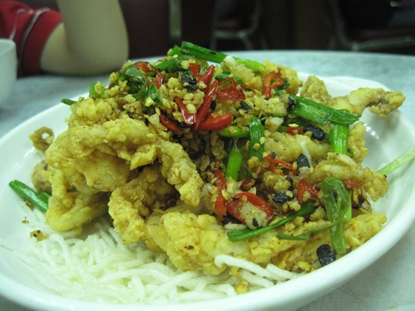 蒜蓉、黑胡椒、辣椒就是『避風塘』做法的同義詞,不香辣不算數啊!原本要的乾魷沒了,改鮮魷,一改就錯,麵衣偏甜,首先就犯了本人大忌,香料欠點火,不妙,如果一個熱湯飯能把白胡椒處理的這麼好,沒道理大火熱炒提不出香!我想或許鮮魷會出水,把原本熗出來鍋鑊香氣給悶回去了,遺憾的殘念。