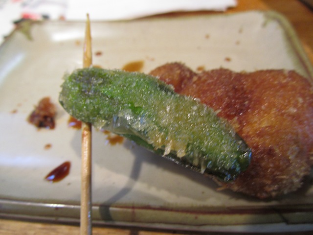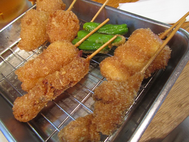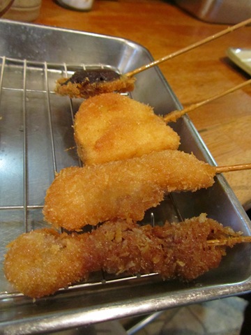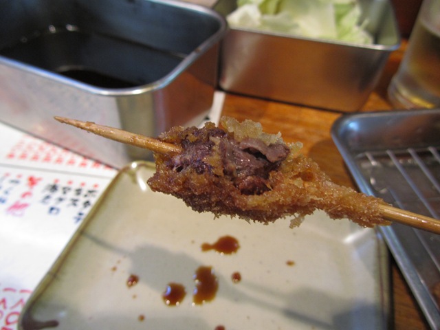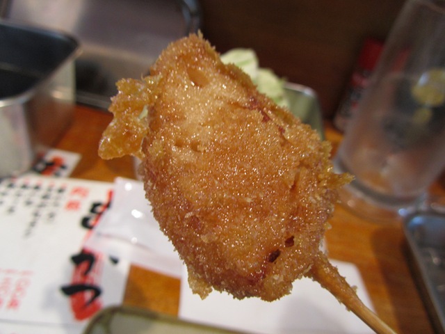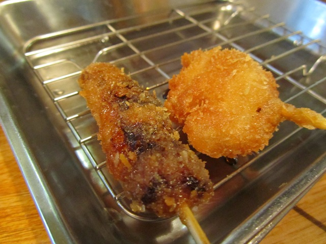吃『串かつ』是有『潛規則』的,點完飲料會先來盆高麗菜葉,別嫌人家寒酸,等等吃的全是油炸食品,多來點青菜才是王道,吃完可以繼續要;另一盆墨色深濃、供食客自由沾取的老滷,才是每家店不同於旁人的靈魂所在,以巴比近一週來的經驗,基本上老店調味濃鹹而味凝,能吃得慣『日本鹹』的人其實會大呼過癮,加上通常油炸時間較長、更為香韌,配酒開懷大嚼實在剛剛好!年輕一代的店則各方面都明顯清爽許多,酥爽感覺直逼高檔天婦羅者大有所在,沾醬更有的幾乎可以用『高湯』而非醬汁來形容了,灑脫暢快,剛出爐的油炸串放進去還會滋滋叫,再多吃幾串也不覺得油膩難耐。
