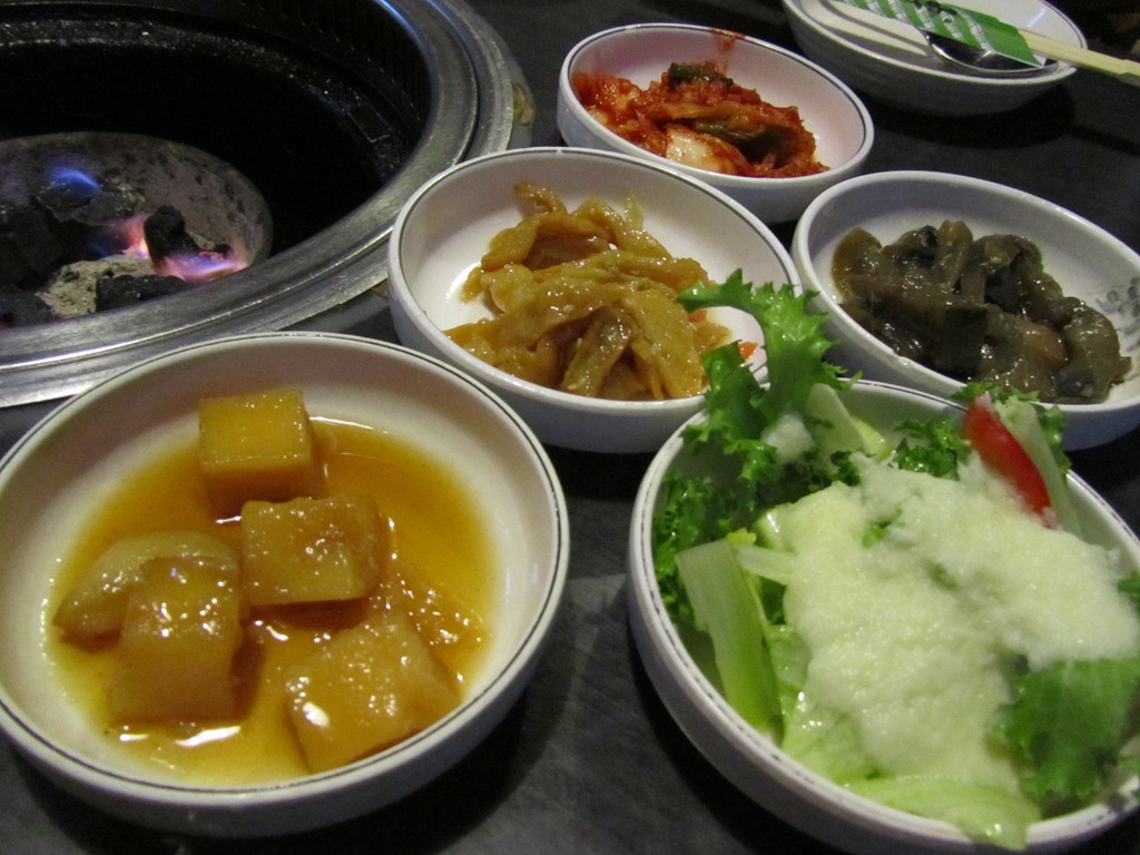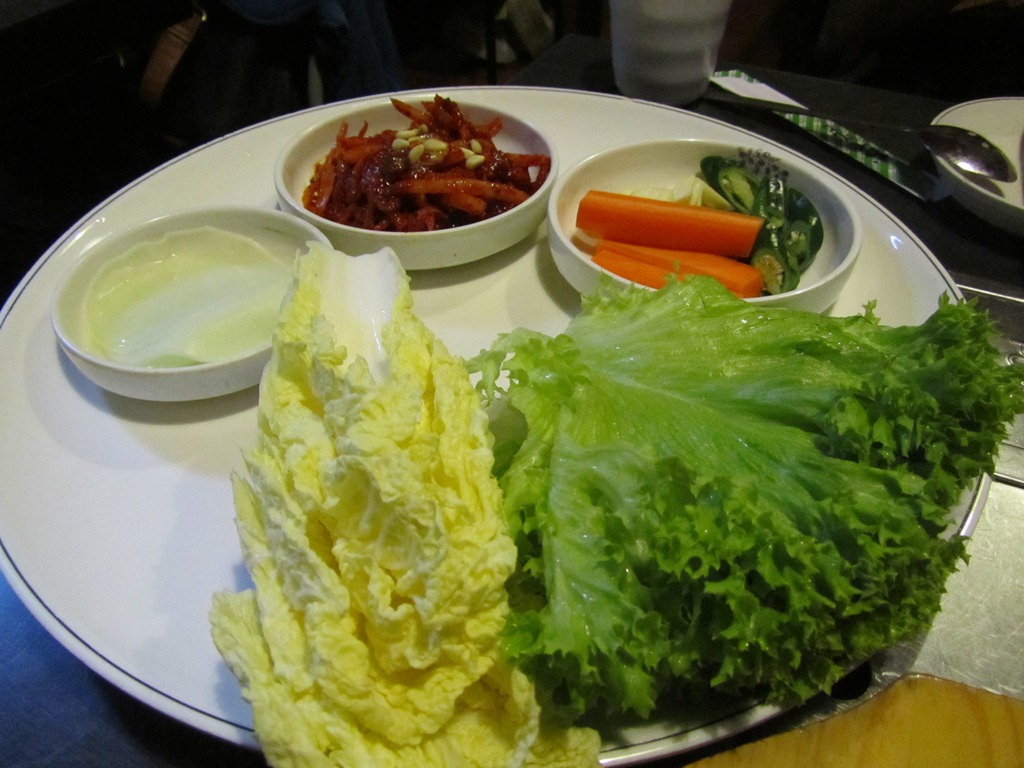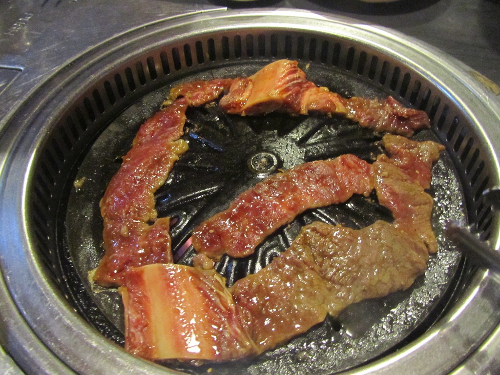 肉片既片的薄,熟的快,好了用大剪刀剪成一口大小,看各人喜好連著醬料蒜片泡菜甚至白飯,拿生菜一包豪邁入口,過癮至極,靠大骨處要多花點時間烤,連附著筋啊肉的是韓國人心中聖品,辣妹貴婦照樣不顧形象啃得不亦樂乎,台灣朋友有時比較不瞭解當地習慣,本該一口大小的被胡亂東加西加包成一大個生菜版肉包,雖說吃喝原是由人所好,不便講這樣不對,但就少了那份順暢寫意。