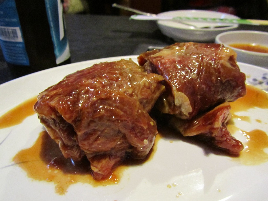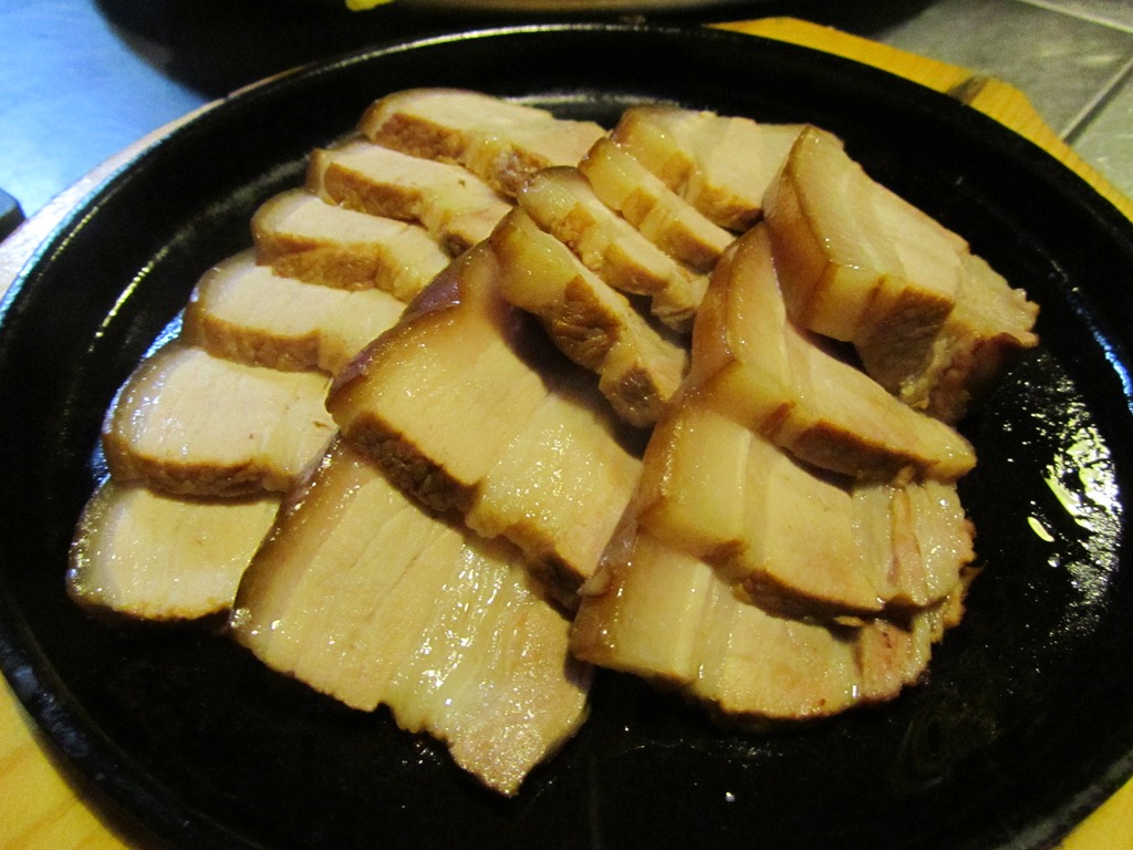 台灣韓國料理店越開越多之多,大概只比號稱『拒用韓貨』的人少一點,可惜吃來吃去,菜單少有不同之處,實在沒創意,感覺只要會煮個所謂豆腐鍋就能開店,其他菜式往往少之又少,無論難易,總別人不去做,市場還沒出來,就大家站著旁邊看,剛才的醃小排是一例,這道先蒸後滷的豬三層肉也是一例,同樣風格的還有滷豬腳,作法相較於中國菜裡的同樣菜式來說實在是簡單到不行,就像韓劇裡會出現的場景,韓國男人的確常常約在路邊攤就這樣大口肉大口酒的吃喝起來,會不會是這種口味在到處是快炒店的台灣人來說太弱所以找不到知音?