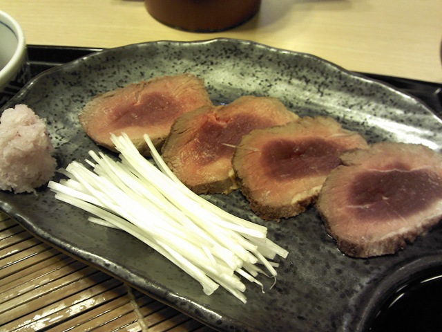 容易不甘寂寞的人就是容易瞎點菜… 『鴨たたき』,當店推薦,那就來一份吧;這種冷盤都是先做好了等人點,鴨胸切盤上菜,白蘿蔔泥和上紫蘇,裹點蔥絲沾淡醬油,算是下酒佳品,唯獨僅有四片未免寒酸,說後悔還不至於,感覺有點冷倒是真的…