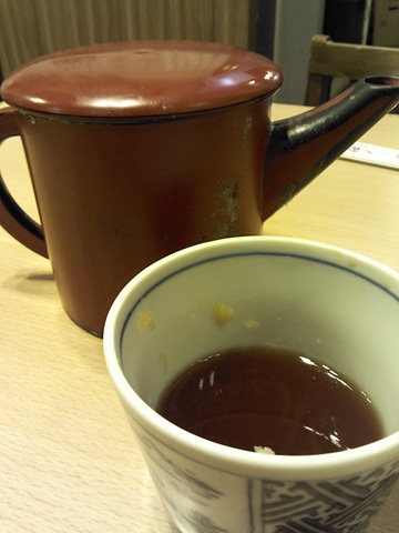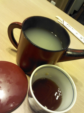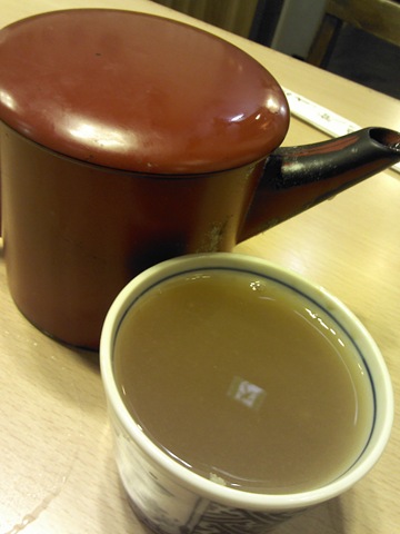 麵吃一半上個小壺,不是請你喝茶,是請你喝煮麵水的!這點跟老北京很合,吃完餃子來碗煮餃子湯,俗話『原湯化原食』是也,算不算是漢唐遺風、我朝留俗啊?咱爹當年自己家裡煮水餃時也愛來這套,只是現在到處都是機器水餃工廠成品,水餃本身就夠難吃了,煮餃子湯就算餵豬也喝不下去!江戶老店秉持傳統,一灶老鍋專門煮麵,這煮麵湯當然就是由此而出,色呈黲灰,實話說來並不賞心悅目,且靜下心,細一聞,白麵與蕎麥麵粉香同出一氣,化在熱風裡,拂上滿面春,是這個味了,倒進沾麵醬油杯裡,滿滿的,一點點辣、一點點嗆、一點點鹹,好像還有點… 甜?我想到兩年前的AMSTEL,那麼的微不足道,那麼的充滿感慨。