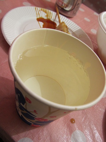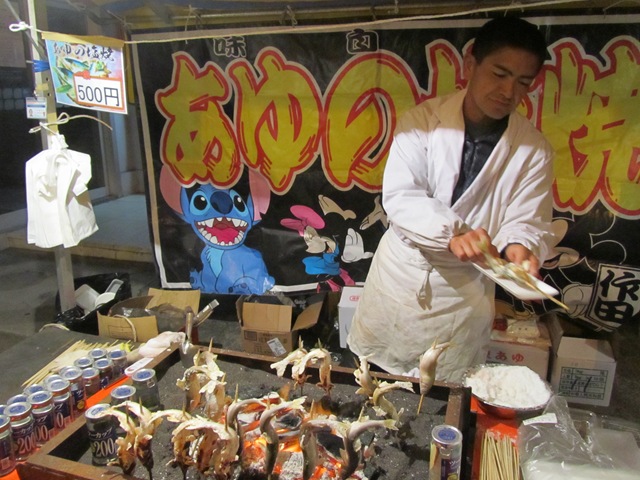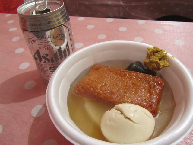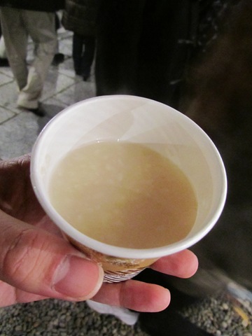 淺草寺咱家八點去排隊都等了快三十分鐘才輪到參拜,這還不算是新年初謁ㄟ!總之排完隊我又肚子空空了,寺前廣場滿滿廟會攤位,說找不到吃的那就太矯情了,老頭一枚,尋個熟食攤,坐進去再說,關東煮、章魚腳、海螺,說真的還真不少東西呢,老頭來對了地方,一罐Asahi加一杯知名不具日本酒,簡單完成禦寒第二攤!