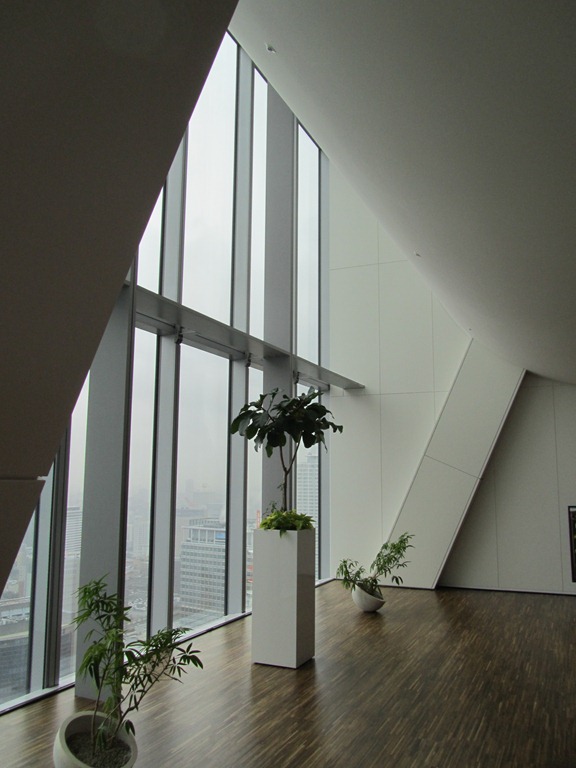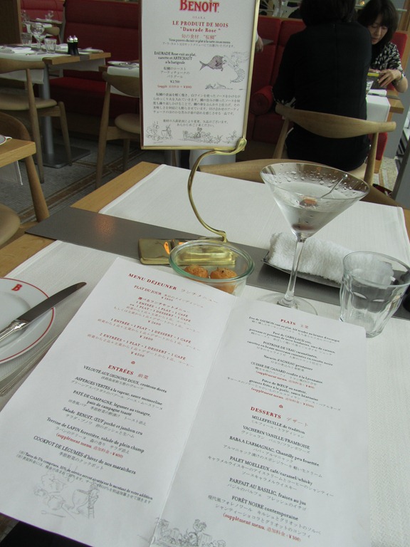 中午理所當然以套餐為主,他方便我簡單,選了一前菜、一主菜、一甜點的套餐,標準到不能再標準的標準,待餐前就用一杯 Dry Martini 當開場白吧,上面還飄著醃橄欖的一點油,伸伸腿,這麼高的樓層,往外望,隨便都能欣賞一下雨霧中的大阪。