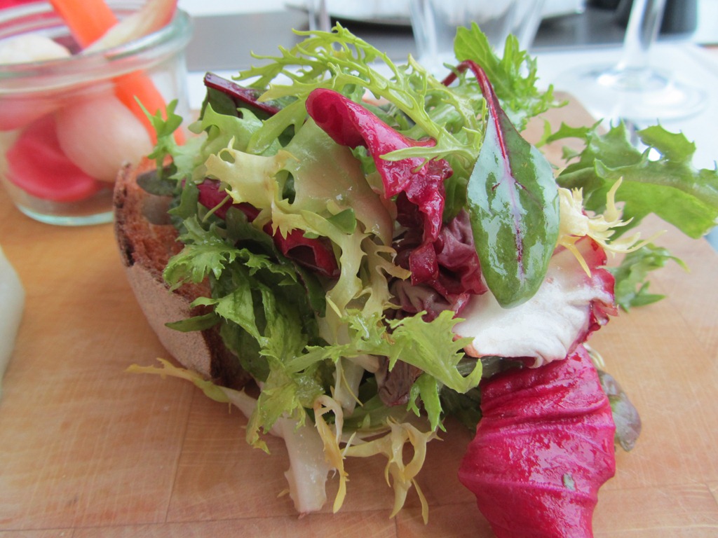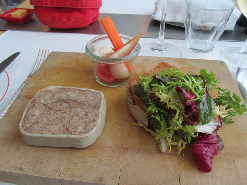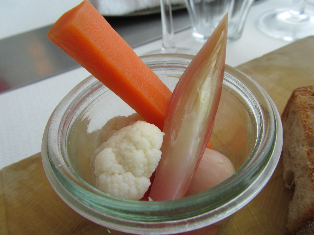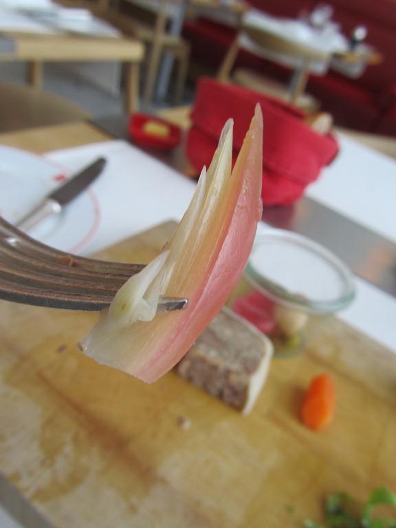 前菜:Pate de Campagne,legumes au vunaigre;如何知道春天要來了?當台灣人一窩蜂跑到日本去看櫻花、而日本人都在超市挑『春野菜』時,就對了~ 茗荷、紅蘿蔔、白花菜、蕪菁、洋蔥用醋醃過,搭配上精挑嫩葉的沙拉,還有經典款鴨肝捲,很奇妙的,不知道是本身原味、還是泡過醋的關係、又或者是佐餐白酒的影響,這茗荷漬物吃來有一種微微、非常野性的騷味,讓人有種會心一笑的快感!