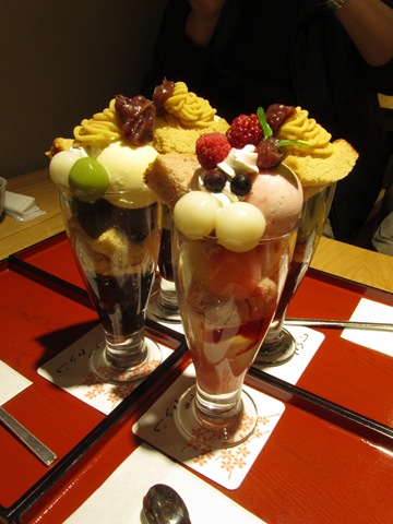 尤其是來自美國本土的聖代,大量冰淇淋為主,少不了的鮮奶油,再加上一堆威化餅、碎果仁、七彩糖等等,甜死人不償命,胖不起來不要錢,吃來威猛,吃完(如果吃得完啦)爽快!パフェ內容物似乎比較固定,一兩球冰淇淋,湯團子,新鮮水果,幾小塊蛋糕,清爽宜人,雖然熱量應該依舊高的嚇人,但嘴巴裡的感覺可就健康無負擔多了。