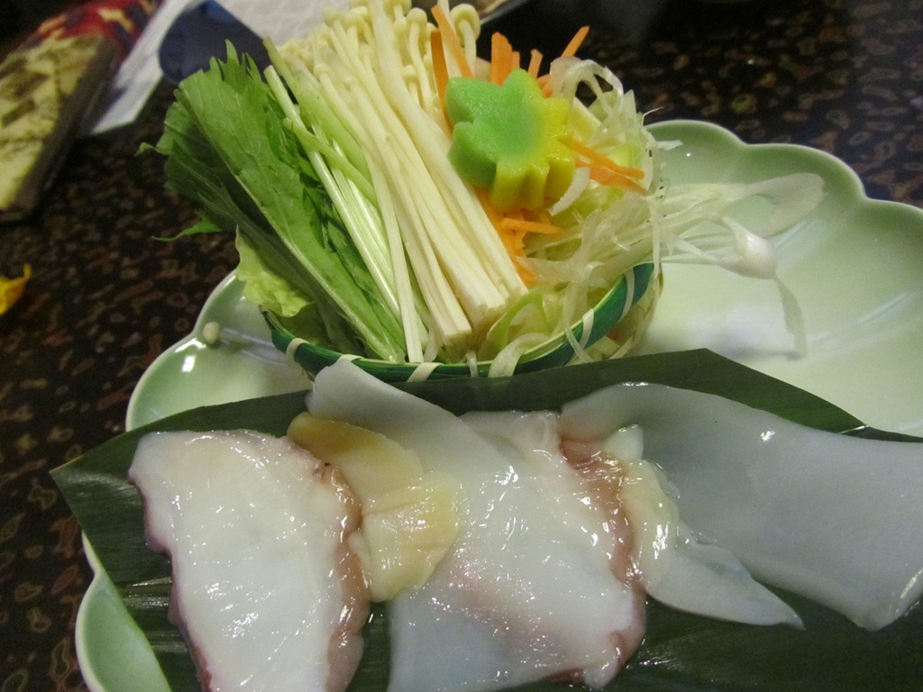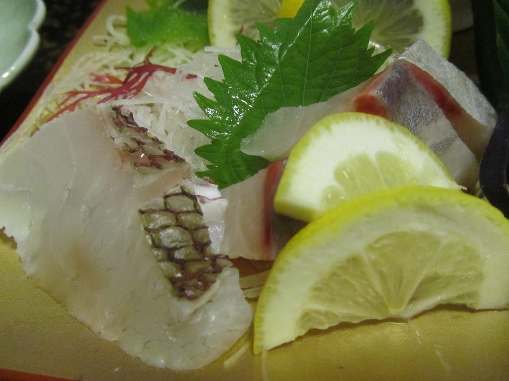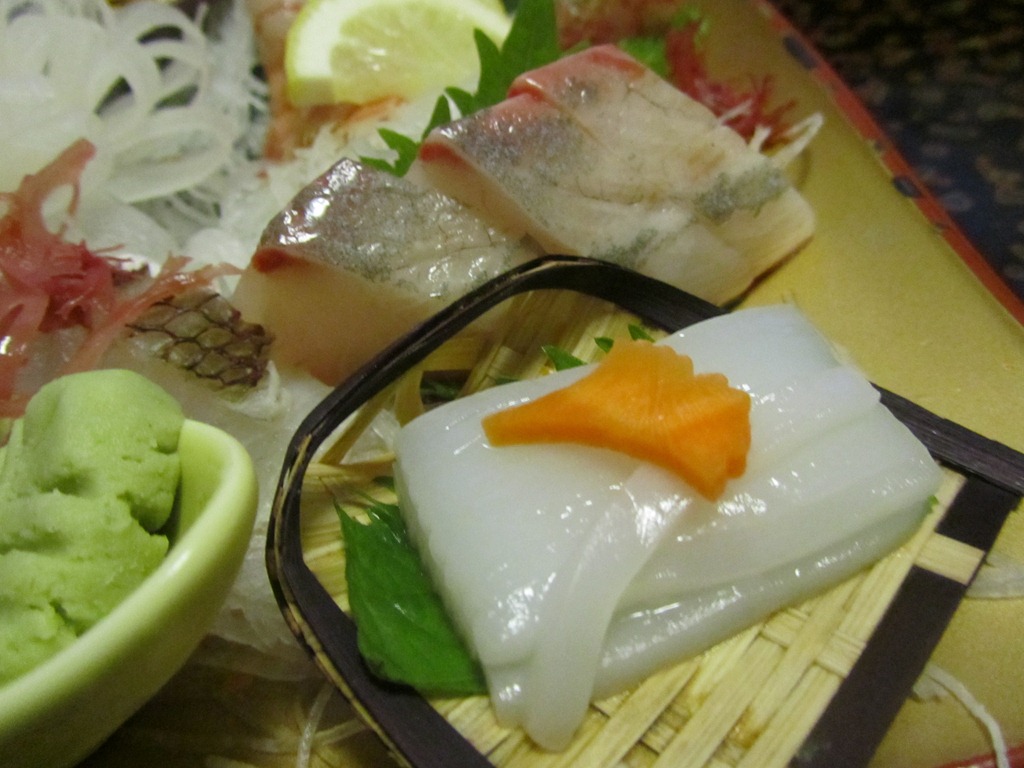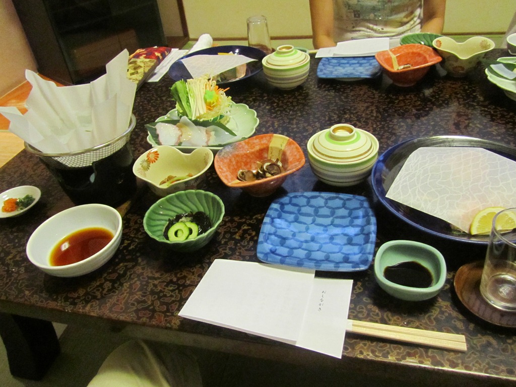 跟預定的餐廳訂在晚上六點,信步沿著海岸走過去,剛剛好!女中出來迎接,出乎意料的用堪稱流利的英文接待,真是想不到啊,我還以為到了這鄉下地方一切都要靠自己了呢;帶著往二樓走,用餐包廂其實設備看來頗寒酸,帶著慘白的燈光,和式榻榻米房約莫十坪大,前有廁所跟洗手台,這是早期日本旅館房間內的布置,原貌改為餐宴個室,以現今標準,斑駁太多。