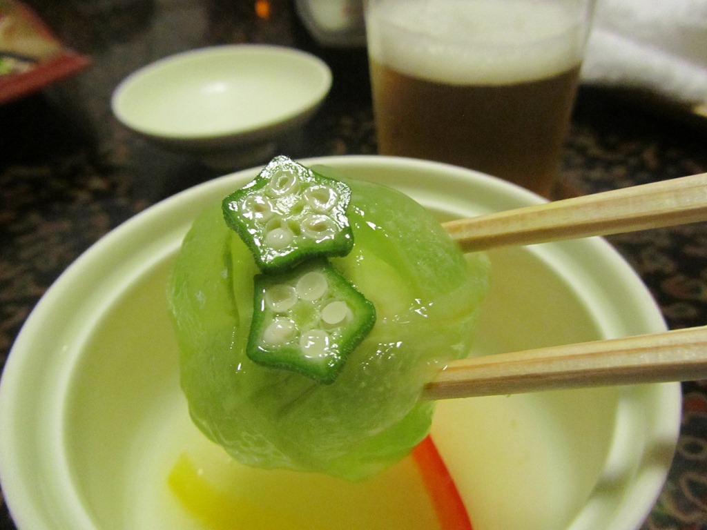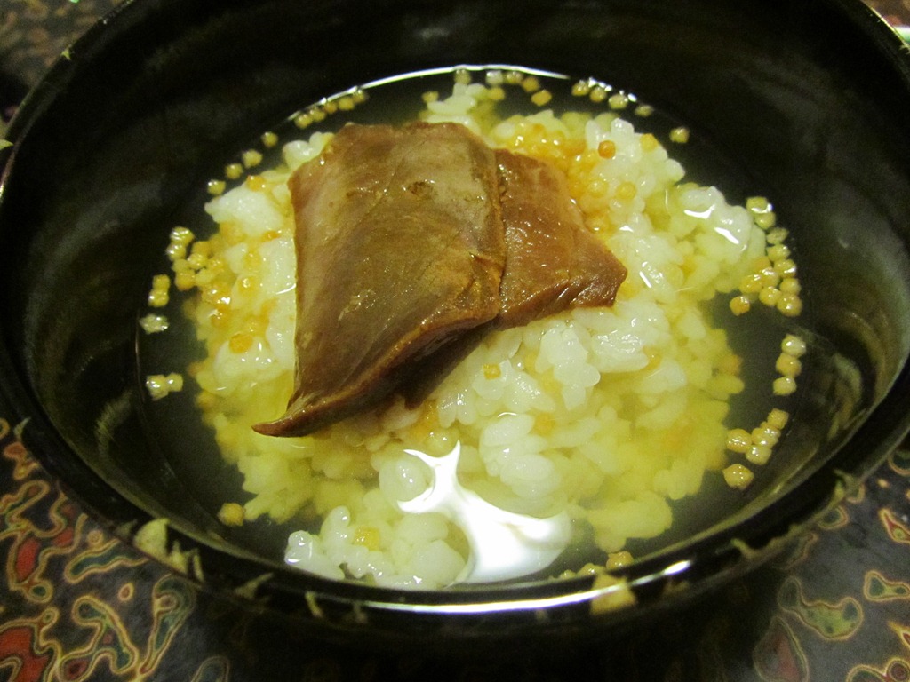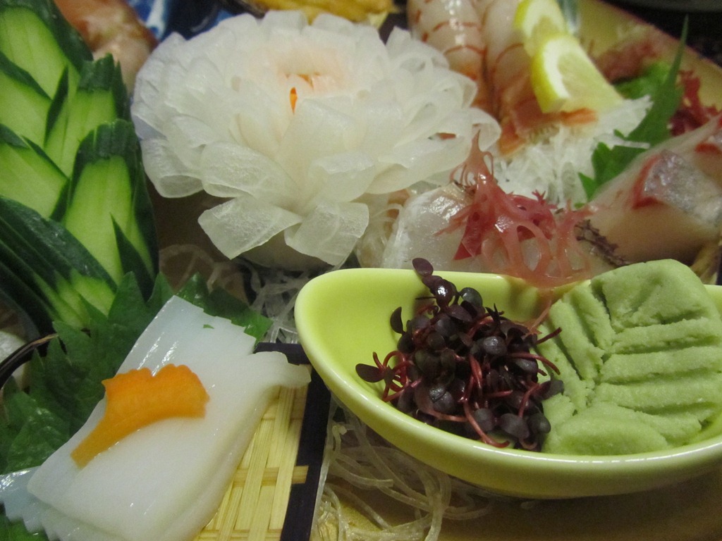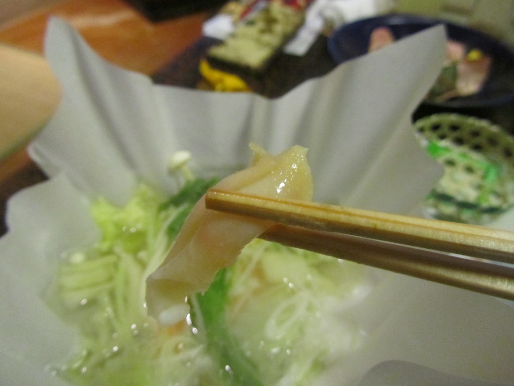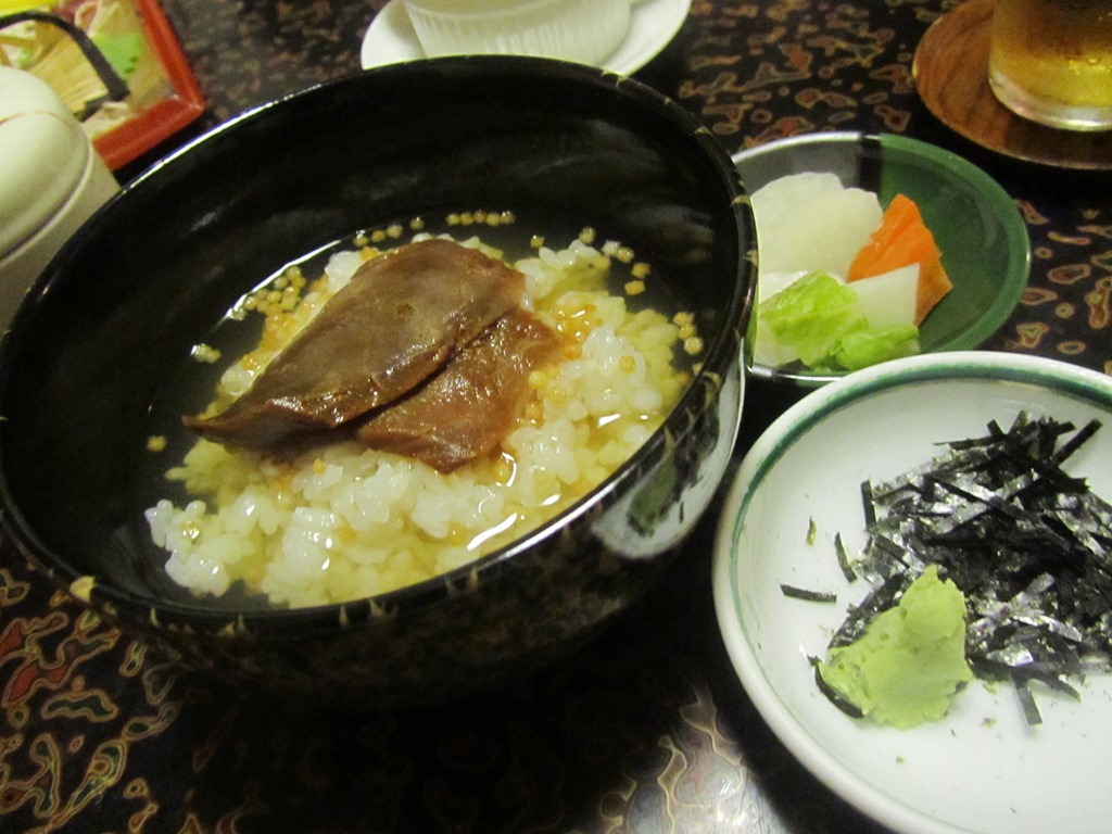 跟預定的餐廳訂在晚上六點,信步沿著海岸走過去,剛剛好!女中出來迎接,出乎意料的用堪稱流利的英文接待,真是想不到啊,我還以為到了這鄉下地方一切都要靠自己了呢;帶著往二樓走,用餐包廂其實設備看來頗寒酸,帶著慘白的燈光,和式榻榻米房約莫十坪大,前有廁所跟洗手台,這是早期日本旅館房間內的布置,原貌改為餐宴個室,以現今標準,斑駁太多。