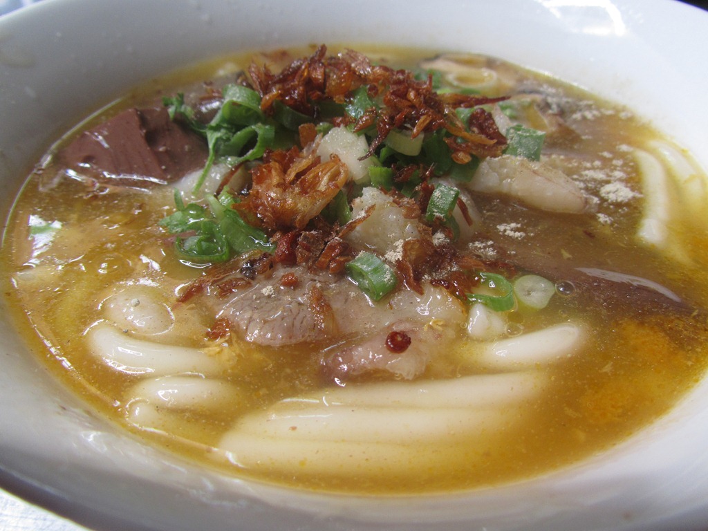 以前好像有寫過這家吧,附近有位越南新住民遠嫁台灣,就在家前院子擺個攤位,雖然沒掛上招牌,賣的東西可毫不含糊,必備的春捲、湯粉當然都有,一般類似小吃攤難見的乾拌粉或是現烤排骨都是隱藏版菜單,台灣人到了這邊得好好研究一下才行,而且每天會有一款特別準備的『主廚推薦』,每週還更換一次內容,跟千篇一律牛肉河粉打通關的根本就不屬於同一等級,用心準備的程度不下各大餐廳,生意好的時候,八九點開市,十一點就告售罄;像照片上這碗八十塊的『蟹黃鴨血順化米粉』,剛好是那個禮拜三的特餐,可你要換個漂亮磁碗,換個有冷氣吹的室內,一碗改賣台幣兩百以上不成問題!