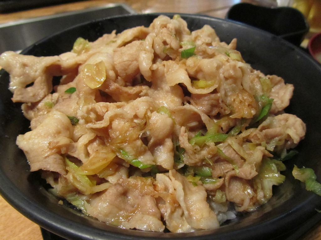 主要商品是現炒豬五花飯,年輕師傅現場大火爆炒,薑泥青蔥,新鮮又帶勁!之後去過兩三次,從原料到口味、呈盤每次都能維持幾乎一致的高水準,可見集團教育訓練與要求標準之完善,不得不佩服,比起中央廚房配送的其他牛丼連鎖店,真是有誠意多了~