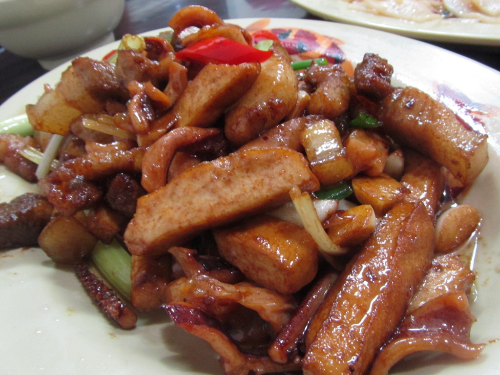 店裡用足有我 2/3 截小拇指尺寸的三層肉絲,大火下鍋,燒足了鮮豬油再爆香豆乾、魷魚、芹菜、蔥段,煸至酥脆,再下米酒醬油一陣乾燒,東西吃進嘴裡奇香而爽朗,吃完盤底一泡透徹晶亮的油,這東西聽說會造成心血管阻塞,我特意嚐了一匙,口中卻是爽朗的節奏感,嚐過這味的人有誰能跟它說不?邊啜著自己跑腿買來的啤酒邊吃著,『停不住嘴』這種浮濫的形容方式倒成了唯一作為;想那天龍國裡同一道菜,材料都片小切細,還不敢帶一點油花,出來的成品固然細緻美觀些,但下鍋炸不出天然油、煸不出自然香,只好多用炒菜油,又為了趕上菜,鍋裡功夫做不足,只剩得香氣、口感、醬色,皆心有餘而力不足,無一者能到位,最後總和全泡在燒過其他兩百道菜的沙拉油裡,能好吃?我頭剁給你!