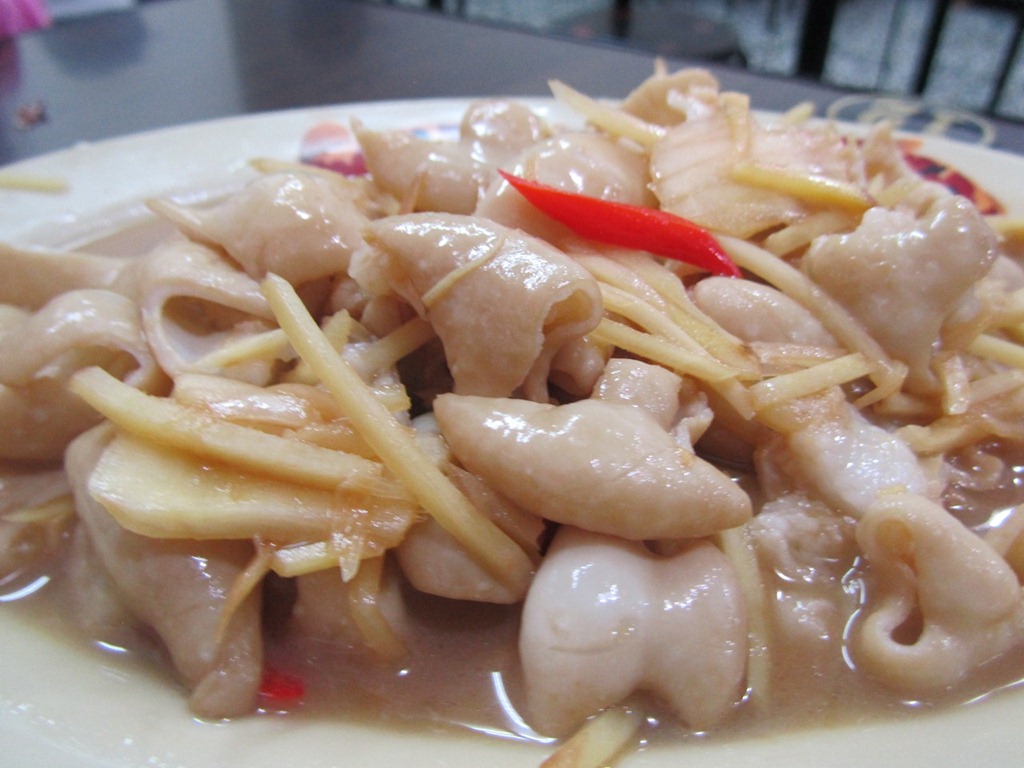 再看一次這圖片,才發現他們的薑絲還真搶戲,切的好粗啊!是否真的刀工不如人,且後論之,但下了鍋,那味道可就濃重過癮多了!腸子洗淨就炒,彈濡兼備,溫順富嚼頭,配著啤酒不自覺嗑了大半,過癮。